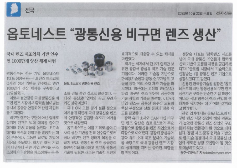 (주)옵토네스트가 국내 광통신용 비구면 렌즈 시장에 본격 진출하며 연간 1,000만 개 규모의 생산체제를 구축했다. 이번 생산라인 구축으로 해외 의존도가 높았던 부품 공급망 안정화와 산업 자립화에 기여할 것으로 기대된다. (주)옵토네스트 측은 “고품질 기술력을 기반으로 국내외 광통신 렌즈 시장에서 선도적 위치를 확보해 나가겠다”고 밝혔다.